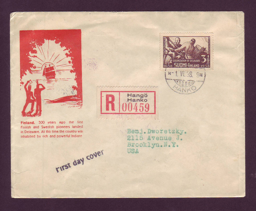 FI5032 Finland Registered FDC to USA, Colonization of Delaware 1938